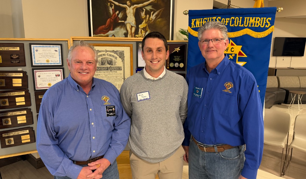 Our council had one new member and a new transfer into our council at our January meeting. From L/R are Mark Mason (Grand Knight), Steven Schonfeldt (Transfer Member), Richard Day (New Member), Ben Biller (Membership Chairman).