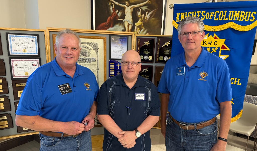 Tom Young transferred into our council and advanced through the third degree just prior to our monthly council meeting on May 1st. Tom has been a Knight for 15 years and is transferring from his home parish in St Louis. Pictured L/R is Tim Kane (Grand Knight), Tom Young, Ben Biller (Membership Chairman).